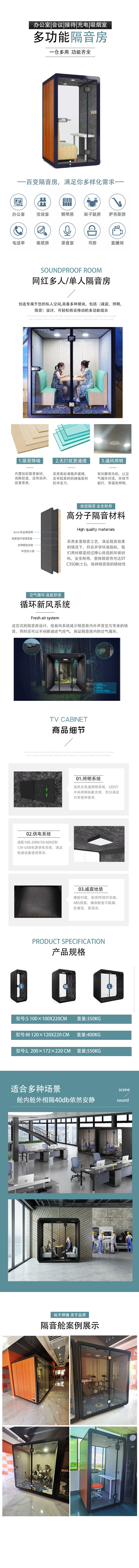 直播间隔音房是一款有着隔音降噪功能的移动玻璃间,在隔音房内进行吸音处理以及针对外部的隔音处理,阻隔内部声音可达30-40分贝,阻隔外音可达15-20分贝,目的主要是为了不让隔音房外的人听到里面的声音,大幅度降低隔音房外部噪音对房内的影响 隔音间类似一个大的隔音罩,立体面采用钢化玻璃,吸音板 吸音棉和隔音板等材料,此隔音的方式使室内达到低噪音环境。