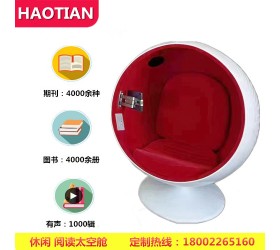 产品特点:浩田视听休闲太空舱可以阅读数字书报刊,也可以听书、听音乐,也可以看视频课件等,还可以通过蓝牙播放手机音视频。让读者在这又酷又炫的太空舱体验感知新科技、新数字、艺术化的数字体验空间。
