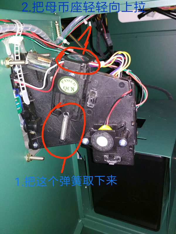 1.先把投币器弹簧取出,投币座往上拉