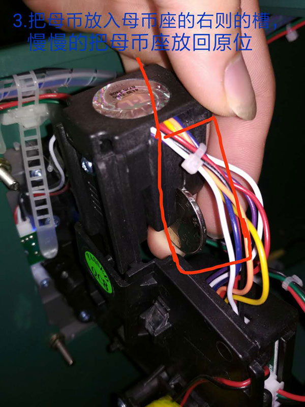 2.准备好母币(硬币、游戏币)放入母币座的右侧槽中,并慢慢把母币座放回原处。