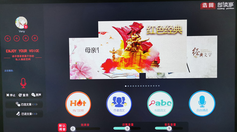 浩田朗读亭为了庆祝祖国的70岁生日,添加了大量的爱国素材,如:红色家书、习近平总书记系列讲话、诗作、庆祝新中国成立70周年、建党98周年等主题。