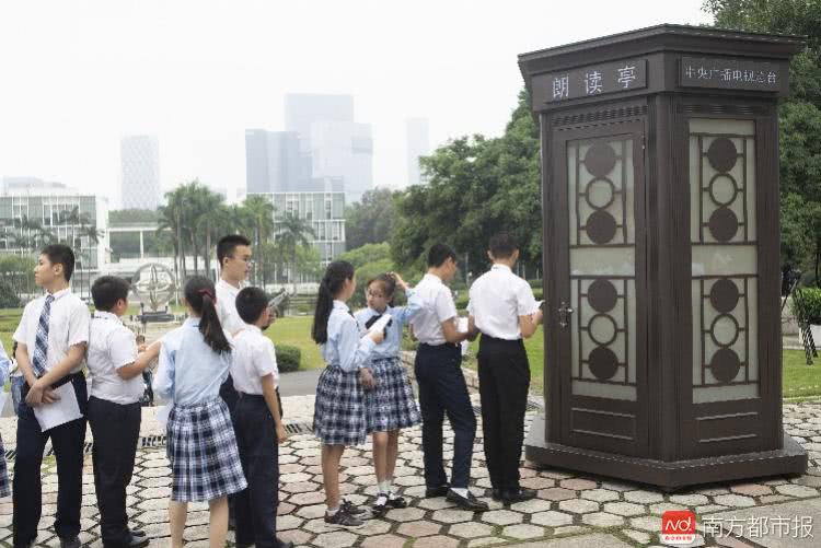 深圳外国语学校的同学来到深圳大学体验朗读亭,同学们在朗读亭门外排队。