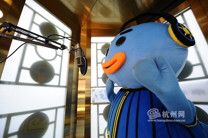 一位市民打扮成一只萌萌的卡通形象,走进录音棚朗读。