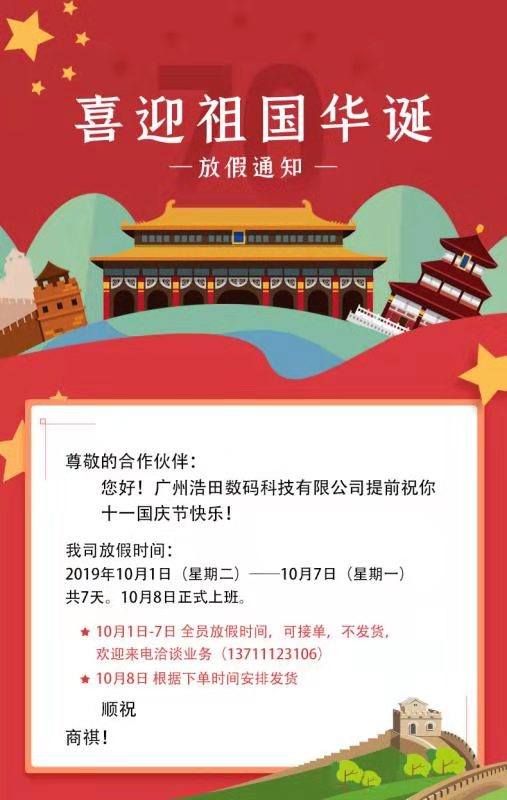 喜迎华诞70周年,2019浩田国庆假期通知