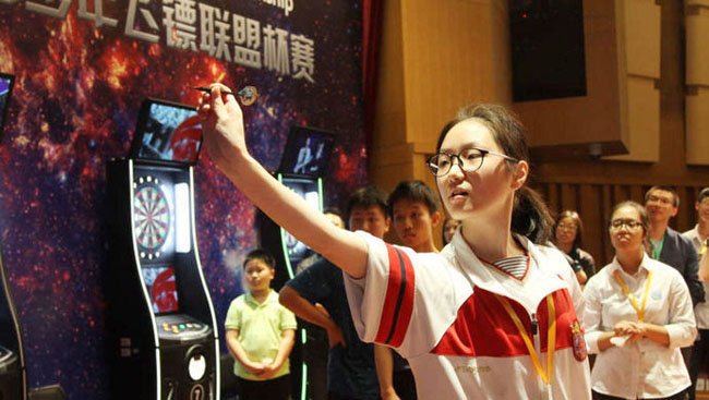 可能在一些学校的角度觉得,学生的功课那么忙,玩飞镖是不是不务正业,57中却破天荒地在学校成立了飞镖队,甚至把飞镖运动引入选修课程中,成为全国首位开设飞镖课程的学校。当其他学?;乖谖募忧垦郾=〔俚氖焙?,57中已经把练习飞镖作为?;ぱ哿?,缓解眼部疲劳的途径。到现在为止,飞镖运动都已经在学校驻足三年,飞镖机已经普及开来,一字排开,成为校园大礼堂上的一道倩影。