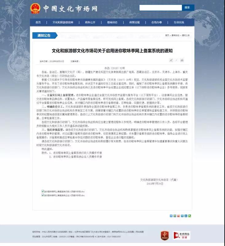 与此同时,也出现了设备安全难保障、卫生环境较差、歌曲内容违规或者侵权等问题,针对这些问题,2017年,文化和旅游部发布了《文化部关于引导迷你歌咏亭市场健康发展的通知》,全面规范了迷你歌咏亭市场,近日,文化和旅游部文化市场司印发了《关于启用迷你歌咏亭网上备案系统的通知》,通知要求各相关部门全面实行网上备案管理,并明确了权责分工,规范了迷你歌咏亭的日常管理和监督检查工作。此消息一出,一石激起千层浪。