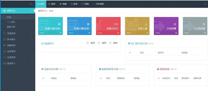 数据统计:支持显示当日书刊借阅统计、当日图书流通统计、热门图书排行统计、图书分类数量统计、月借书量统计、图书借阅趋势统计、图书分类数量统计、按月分类借阅偏好统计、图书状态统计等功能;