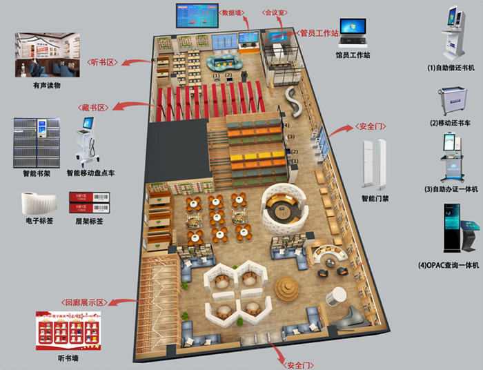 智能化图书管理系统由:自助办证机、自助借还机、RFID安全门、自助杀菌机、馆员工作站、OPAC查询系统、智能盘点推车等,完全实现图书馆自助化管理。