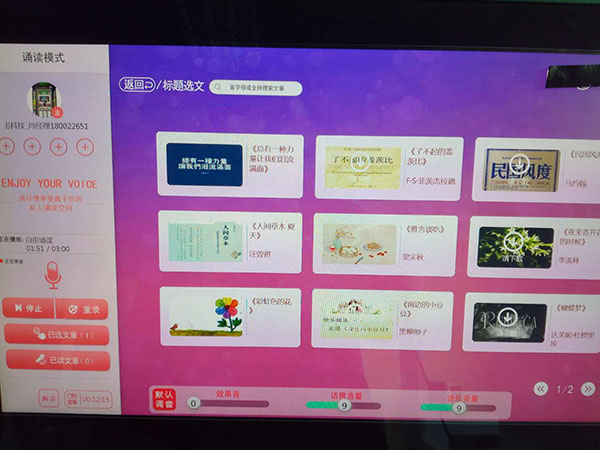 二,录音房点歌系统出色,重新开发的朗读亭,简洁化的选歌界面,多样化的朗读材料,精细化的操控平台,都为用户提供更好的朗读服务;